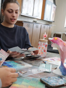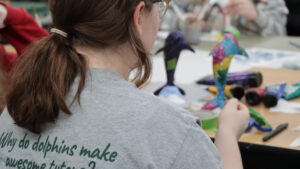 Students in Visiting Professor Kim Waale’s art class took on a bold creative challenge—designing and painting the nearly eight-foot-tall dolphin statues for display around campus.